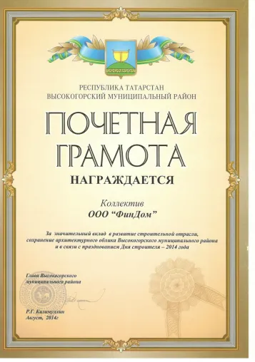 за добросовестный труд и большой вклад в развитие строительного комплекса Республики Татарстан за подписью премьер-министра РТ А.В. Песошина
